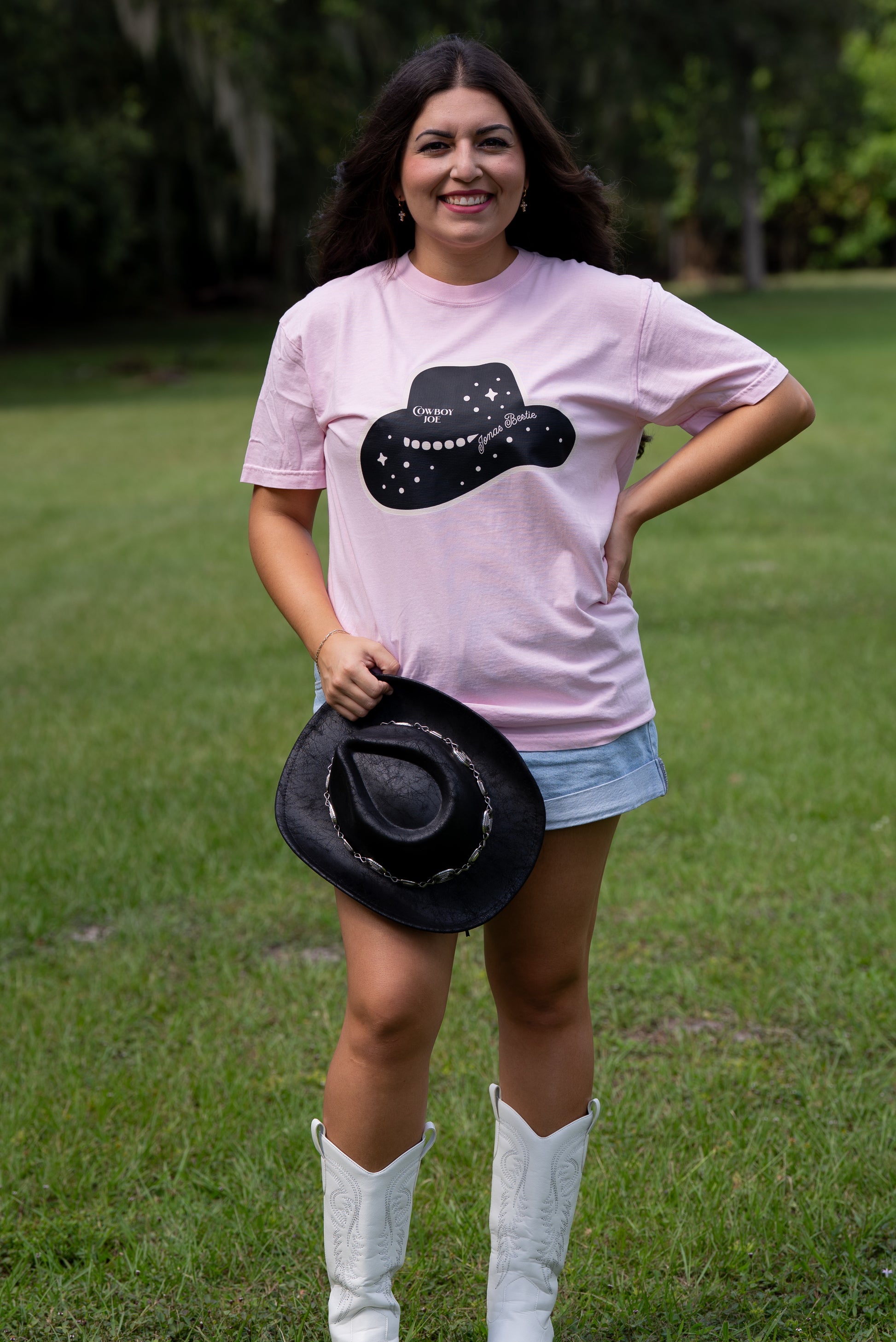Saddle up, Jonas Bestie! Inspired by Joe Jonas and his iconic cowboy hat concert moments, this tee is made for every Cowboy Joe fan! The bold black cowboy hat features the words, "Cowboy Joe" on the front and "Jonas Bestie" along the brim